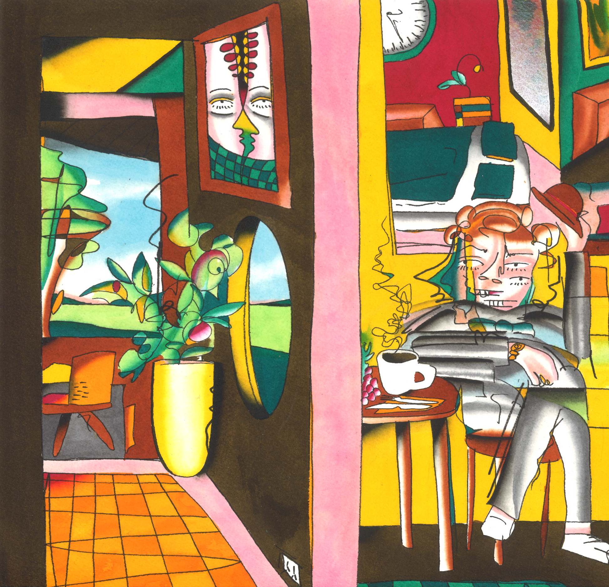 'After Tax' shows a vibrant and palette of contrasting colours and forms. The figure depicted is a man full of solace. Gold-framed watercolour painting, 41 cm x 41 cm, ready to hang.