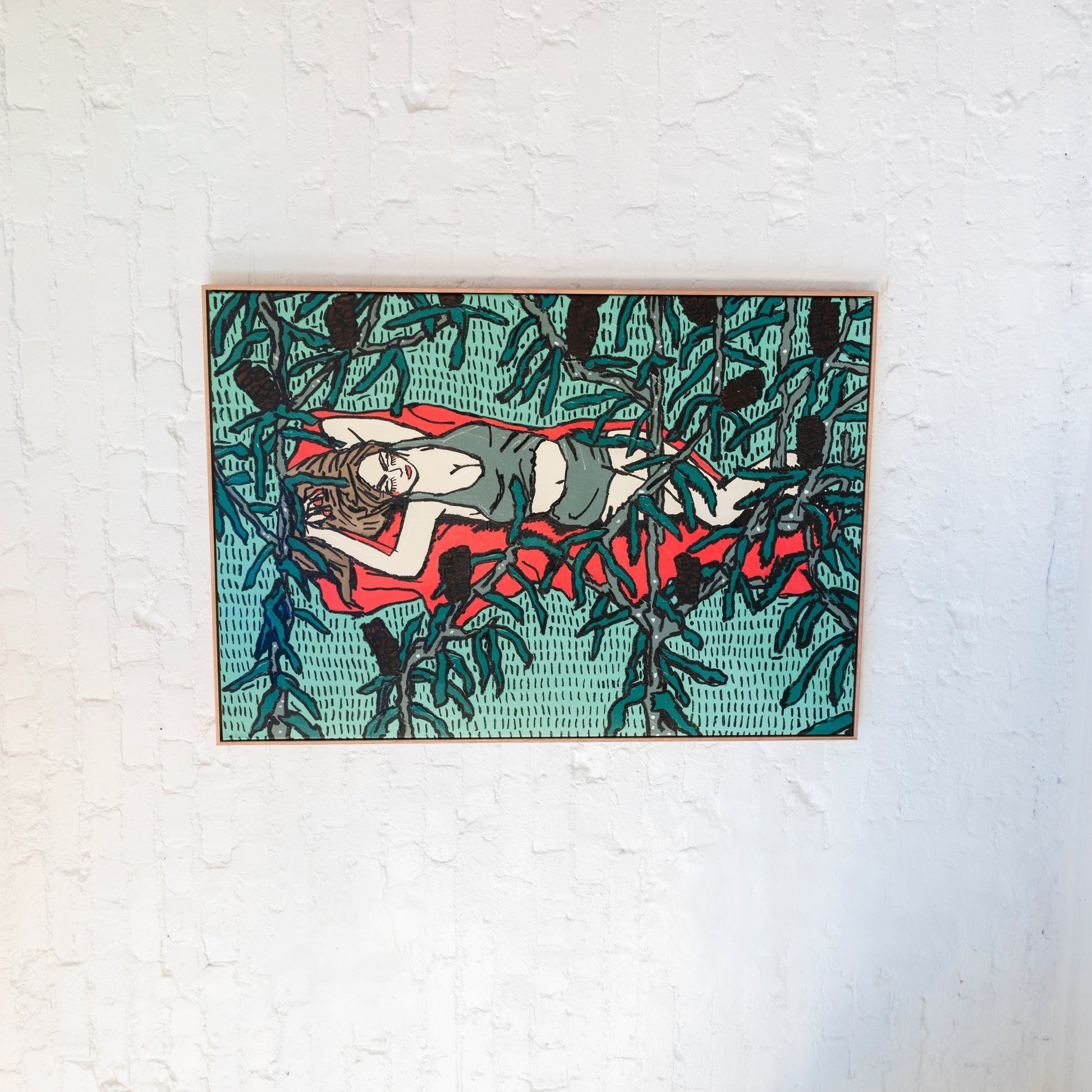 ‘Getaway’ evokes a sense of peace and relaxation, showing a woman lying down in nature. The use of repeated lines mirrors nature's patterns. The mint green surroundings create a calming effect while the vibrant red introduces an artificial contrast. With that the painting aims to capture the rhythm of nature’s serenity.