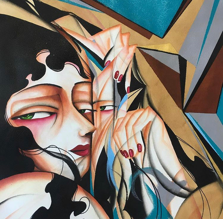 The Reflective Woman series is a Lempicka study of female faces and geometrical block colour using watercolour. All three paintings are created on plain Arches in 750 mm x 950 mm, framed and ready to hang.